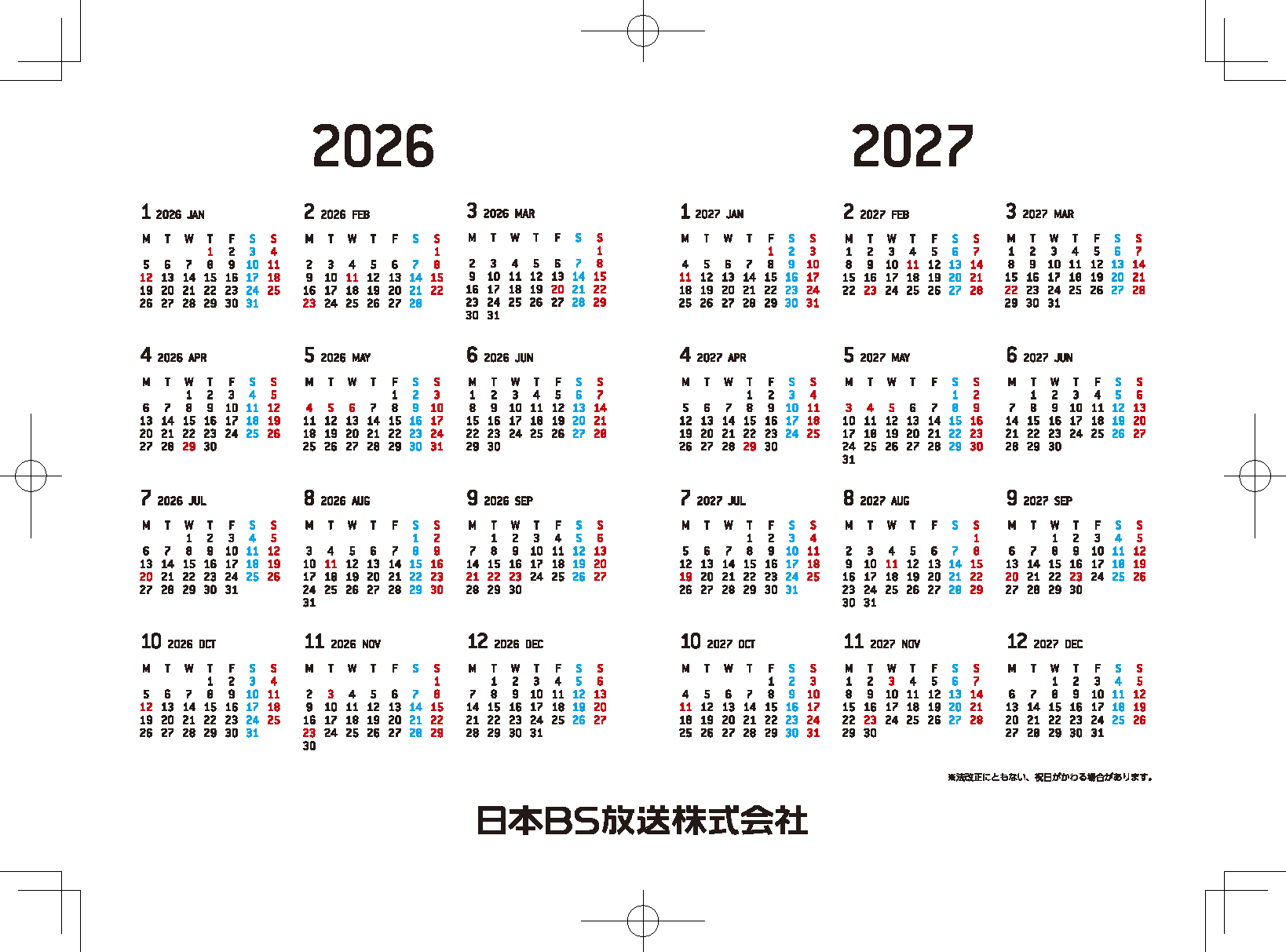 ・表紙の裏は、2026・2027年カレンダー一覧